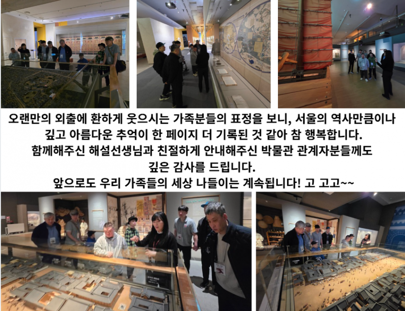 거주인 이야기 | 서울역사박물관 견학 페이지 정보 작성자 장설궁 작성일 26-04-03 17:37 조회 82회 댓글 0건 본문 살랑살랑 불어오는 봄바람을 타고, 우리 평화로운집 가족들은 서울의 역사가 살아 숨 쉬는 '서울역사박물관'으로 나들이를 다녀왔습니다.박물관 곳곳을 둘러보며 옛 서울의 풍경에 발길을 멈추기도 하고, "예전엔 이랬지~" 하며 정겨운 옛 기억을 소환해보기도 하는 뜻깊은 시간이었습니다. 세심하게 준비된 전시물들 덕분에 가족분들도 모두 편안하고 즐겁게 관람을 마칠 수 있었습니다. 다음글 목록